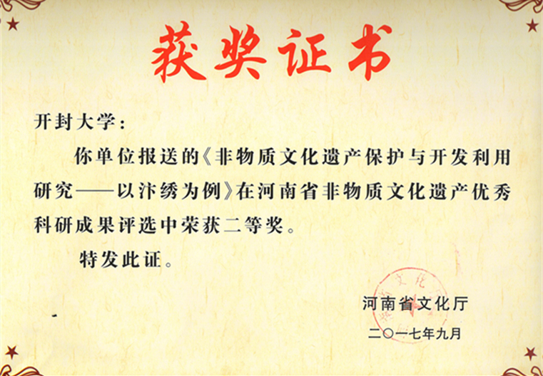 本站訊 日前,2017年河南省非物質文化遺產研究基地座談會在信陽召開。此次座談會由河南省文化廳主辦,河南省文化藝術研究院、信陽師范學院、信陽市文廣新局承辦,座談主題為“非遺的生命力”,河南省文化廳黨組成員、副廳長孫鵬以及來自全省“非遺”研究基地的代表共計60余人參加了此次會議。 各研究基地的專家學者緊緊圍繞“非遺的生命力”這一主題,結合自身研究工作,就“非遺”生命力的維系、文化生態的維護、田野調查的開展、研究基地在“非遺”傳承中的作用等問題進行了充分的交流與討論。 作為河南省(開封大學)非物質文化遺產研究基地,我校選派代表參加了座談會,并以《讓“非遺”的生命力植根于大學——以開封大學“非遺”基地建設為例》為題參加了大會的發言討論。代表介紹了我校“非遺”研究基地、大觀藝術博物館、宋文化工藝品技能大師工作室文化傳承創新育人平臺利用開封的歷史文化資源與校園文化、專業建設、課程建設、社會實踐等相結合,形成了“非遺”活態傳承體系并取得的成果。 會上,河南省文化廳頒發了2017年河南省非物質文化遺產優秀成果獎,我校報送的研究課題《非物質文化遺產保護與開發利用研究——以汴繡為例》榮獲二等獎。