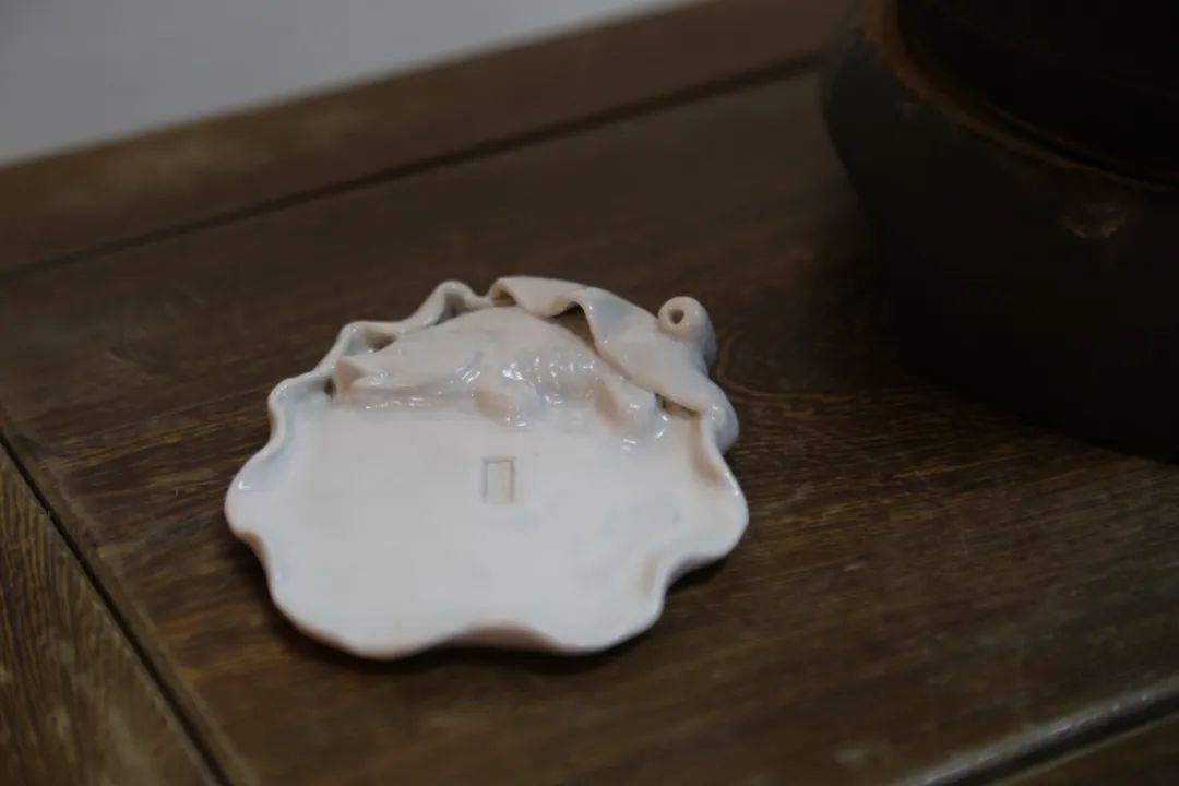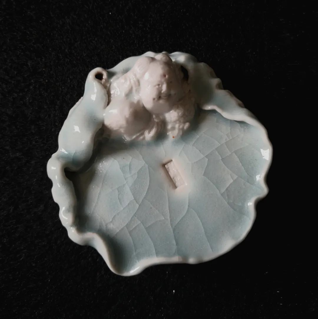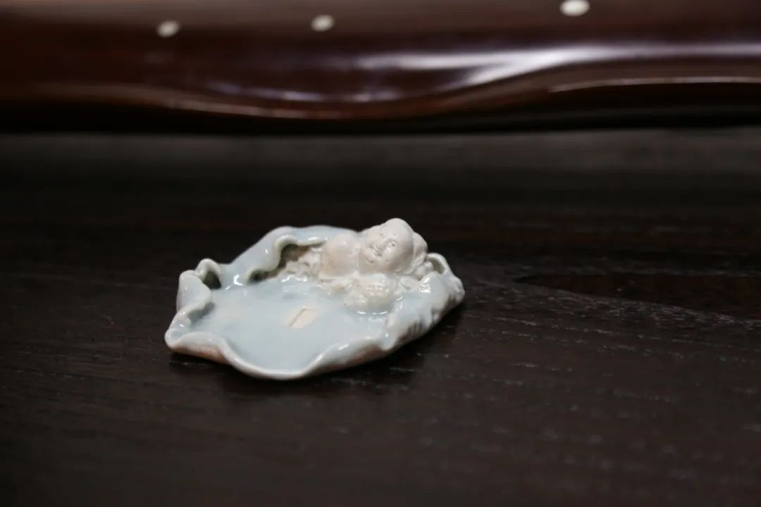 知名宋代陶模收藏家魏躍進教授,追慕宋人美學,以文房雅趣為旨,創制出來一批文房小品,其中就有一批筆舔手作。魏教授這一批作品,樣式多變,大體是以荷葉為基礎造型,其中還雕嵌有童子、魚、荷花等。