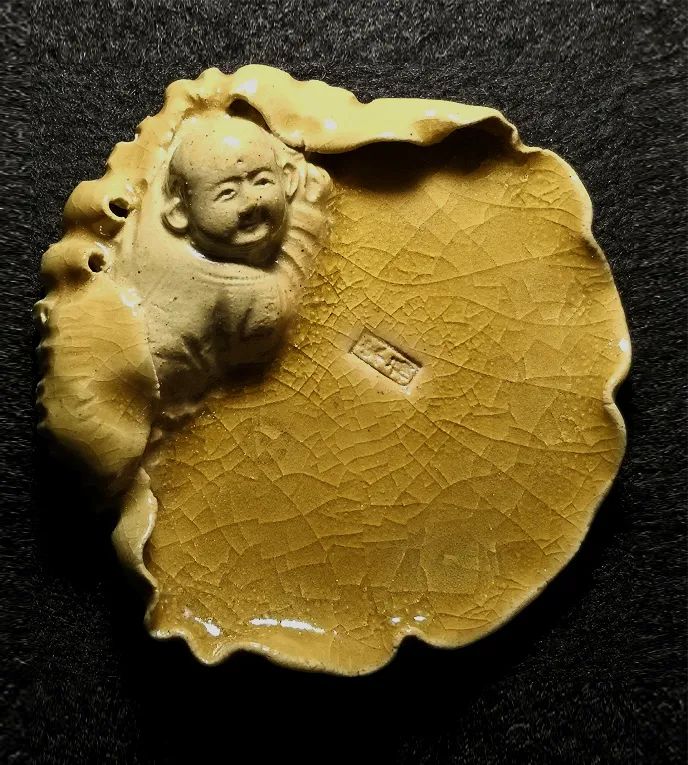 魏教授的這一批作品,名為筆舔,實則可以舔筆、香插和鎮紙三用。作品長寬約十余厘米,周邊以荷葉卷曲,形成一片“內?!?,并塑男童子、女童子、金魚于其上。童子雖有男女之別,但形貌各異,他們或笑,或嗔,或靜,或動,或憨,或巧,件件俱有不同。