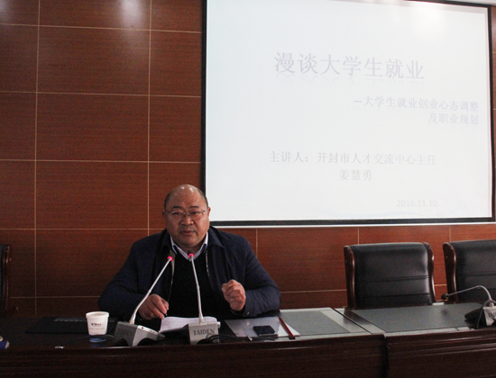 本站訊 11月10日下午,我校在土木建筑工程學(xué)院六樓報(bào)告廳舉行了就業(yè)創(chuàng)業(yè)講座,主講人為開封市人才交流中心主任姜慧勇。我校400余名師生參加了此次講座。
