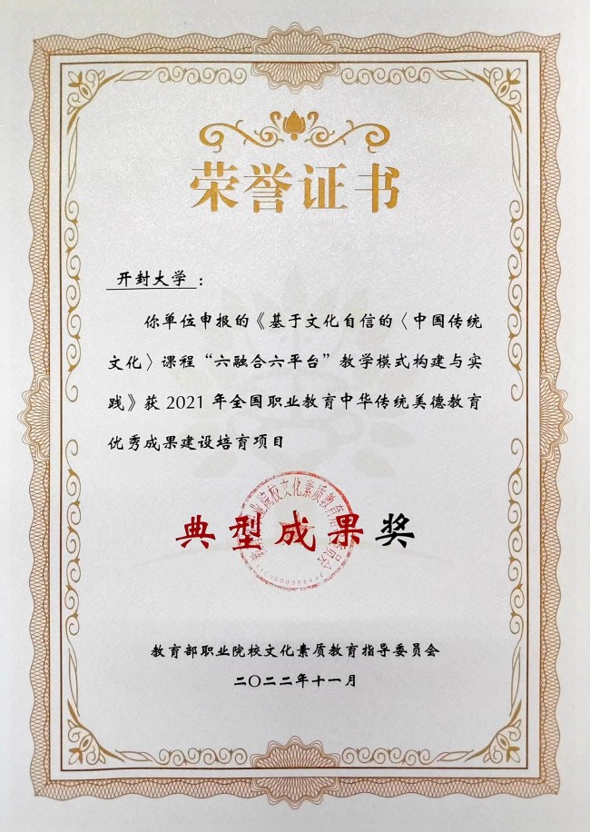 本站訊 近日,教育部職業院校文化素質教育指導委員會公布全國職業教育中華傳統美德教育優秀成果建設培育項目評比結果。我校王茜教授主持申報的《基于文化自信的<中國傳統文化>課程“六融合六平臺”教學模式構建與實踐》項目獲“典型成果獎”。