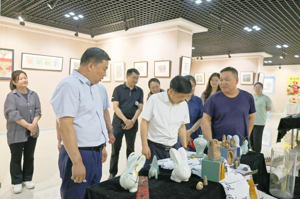 展覽現場,王校長仔細觀賞每一件參展作品,與師生深入交流,詳細了解作品設計理念、文化內涵和制作流程。王德如對作品中體現的創新思維和畢業生扎實的專業技能予以高度評價,對藝術設計學院教學、管理等各項工作給予充分肯定,他指出藝術設計學院探索以設計賦能地方經濟建設、推動作品向產品轉化的實踐模式,非常有創意有特色。