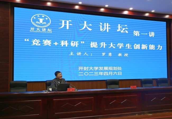 本站訊 4月6日下午,我校“開大講壇”系列報告第一講在行政樓第一會議廳舉行。鄭州大學電氣學院教授、教學委員會主任、系副主任、自動化專業負責人、鄭大信息與控制研究所所長羅勇應邀做了“競賽+科研:提升大學生創新能力”主題報告。校長宋曉煒出席活動,各院部青年教師、學生代表等200余人參加了本次報告。報告由副校長萬是明主持。