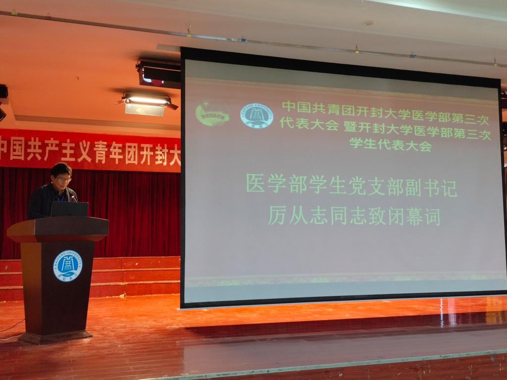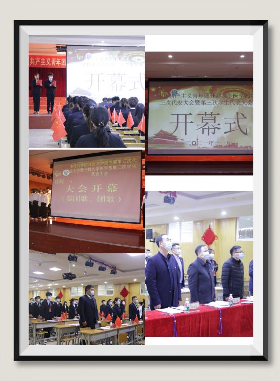 十一月十一日,大會如期而至,開封大學黨委委員、開封市衛生學校黨委書記曾小平、開封大學團委書記劉圣亞、開封大學醫學部黨總支書記謝旭光、開封大學醫學部學生黨支部副書記厲從志、開封大學醫學部團總支書記崔俊莉以及輔導員老師們蒞臨了本次大會。窗外冬日驕陽明烈,室內國歌、團歌莊嚴響起。醫學部各代表著裝整齊,手持國旗,伴隨著歌曲,齊聲高歌。