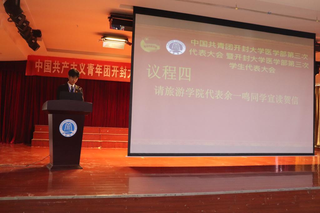 和諧發展,銳意進取。旅游學院代表余一鳴同學代表各院部也宣讀了賀信:預祝大會圓滿完成且銳利進取共同譜寫開封大學醫學教育新華章。大會各代表以熱烈掌聲作為回應。